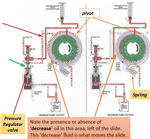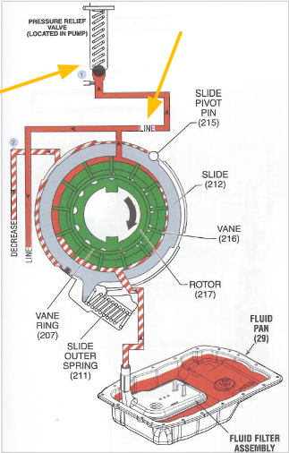 At the core, all pumps function on the principle of creating high- and low-pressure areas. As the pump rotates, the intake side forms a slight vacuum or void, which allows atmospheric pressure to push transmission fluid into the intake area. The vanes then draw this fluid into larger cavity spaces. As the fluid moves along, it is forced into smaller cavity areas, where it becomes compressed. This compression produces higher-pressure fluid that exits through the discharge port. Because the pump is constantly forming alternating low- and high-pressure areas, the system naturally produces pulsations. This explains why, when measuring transmission pressure, the gauge needle often vibrates or oscillates slightly instead of holding perfectly still. | ![]() |