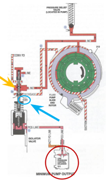 The PR valve operates on a balance of forces. On one side, pump pressure constantly pushes against the valve. On the other, a calibrated spring provides resistance. As pump pressure increases to a certain point, the valve shifts in its bore, momentarily opening a passage to exhaust excess pressure (circled in blue in Figure 18). This cycling happens several times per second, creating a steady and reliable line pressure.