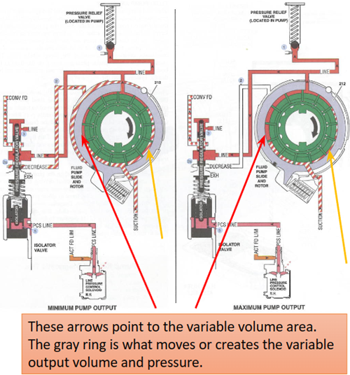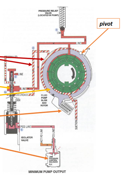 Figure 17 illustrates a variable vane pump. In this example, fluid is drawn through the filter from the sump or pan, pressurized by the pump, and then delivered into the “LINE” passage. This passage is referred to as the main line pressure.