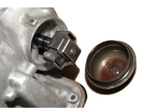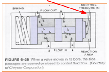At the top of Figure 17, note the round black ball and spring. This is the pressure relief valve. Its purpose is to protect the system by opening whenever pressure rises too high, allowing excess fluid to “blow off” back into the pan.