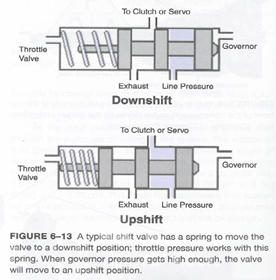 Older transmissions primarily used two valves to regulate hydraulic pressure and control shifting: the governor valve and the throttle valve. Each one directed pressure to opposite ends of the shift valves. The governor valve controlled line pressure based on vehicle speed, while the throttle valve regulated pressure according to engine load. When the gear selector was placed in Drive, the manual valve supplied mainline pressure to both valves.