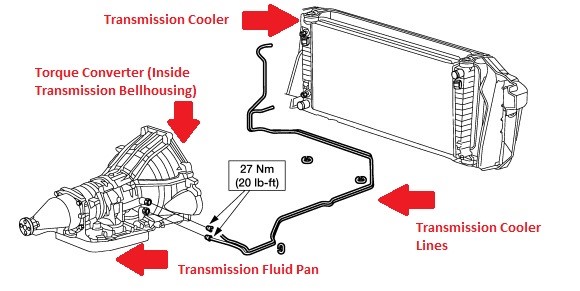 This circuit directs fluid from the transmission pump to either the torque converter or the cooler. Fluid routed to the torque converter keeps it filled and allows the converter clutch to engage or disengage. Fluid directed to the cooler passes through a heat exchanger inside the radiator, and in some cases, through a separate air-to-oil cooler for additional cooling.