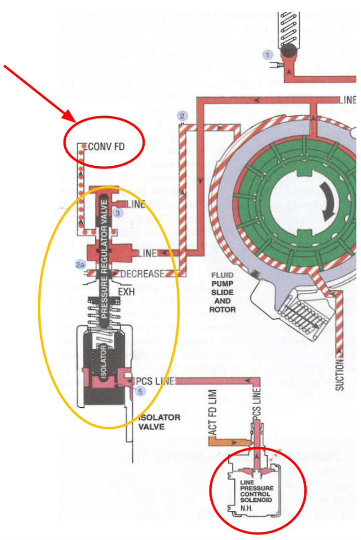 The lubrication circuit begins at the pressure regulator valve (circled in yellow). Here, mainline fluid from the pump is tapped off. Part of this fluid is directed into the Converter Feed (CONV FD) line. The pressure regulator valve and the LPC solenoid (circled in red) continue working together to regulate mainline pressure as explained earlier.