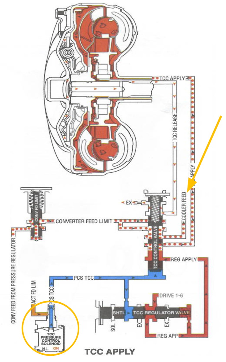 Lubrication flow begins when the TCC Control Valve directs fluid to the Cooler Feed circuit (orange arrow). Fluid is almost always routed through the cooler unless a transmission thermostat restricts flow, as discussed earlier. This cooling path is active regardless of whether the TCC is applied or released.