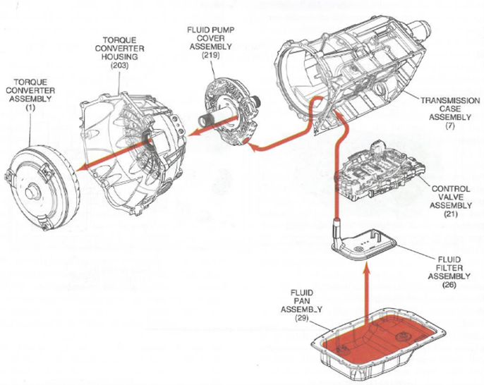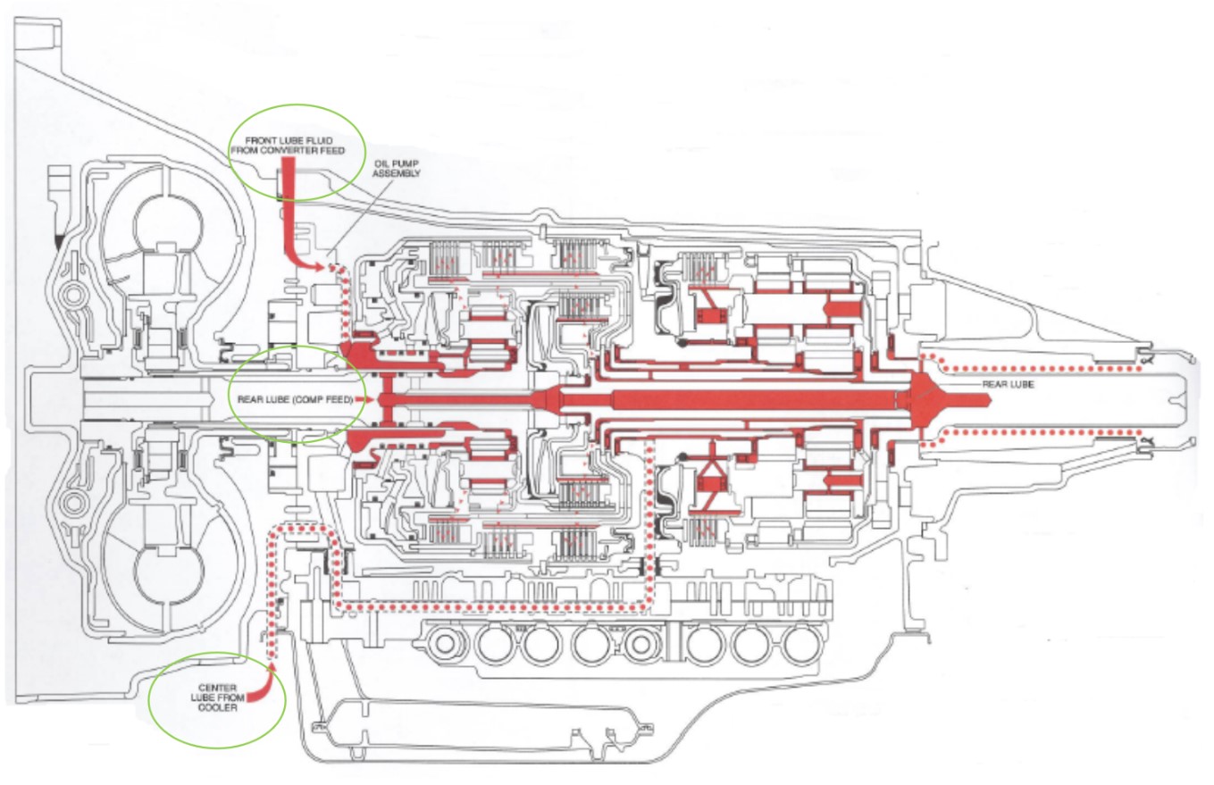 Once cooling and lubrication are complete, fluid travels through lube passages (green arrow) to gears and bearings before draining back to the sump. From there, it is available to be picked up by the pump again and sent back into the valve body or the lubrication circuit.