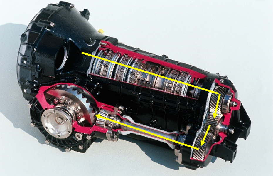 The bottom gear sends power to the final drive unit, which delivers it to the wheels.