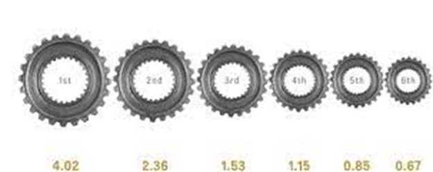 Higher gears such as 4th, 5th, and 6th are lower in ratio (1.15:1, 0.85:1, and 0.667:1). These gears trade torque for vehicle speed and efficiency.