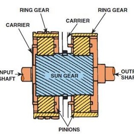 Finally, let’s touch on transfer gears. Some transmissions, like the one pictured in the figure below, use transfer gears to redirect the flow of power. The three gears at the rear of the unit are all transfer gears. Here’s how they work: