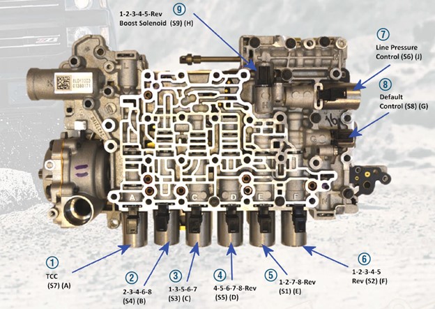The key point is that every gear requires three clutches to be applied for the transmission to deliver power. If any one clutch fails, certain gears will not work. For example, if the 1-2-7-8-Reverse clutch fails, there will be no movement in Drive or Reverse and DTCs will be stored. Another example: for 3rd gear to function, every clutch with a “3” in its name must be working — the 1-3-5-6-7, 2-3-4-6-8, and 1-2-3-4-5-Reverse clutches.