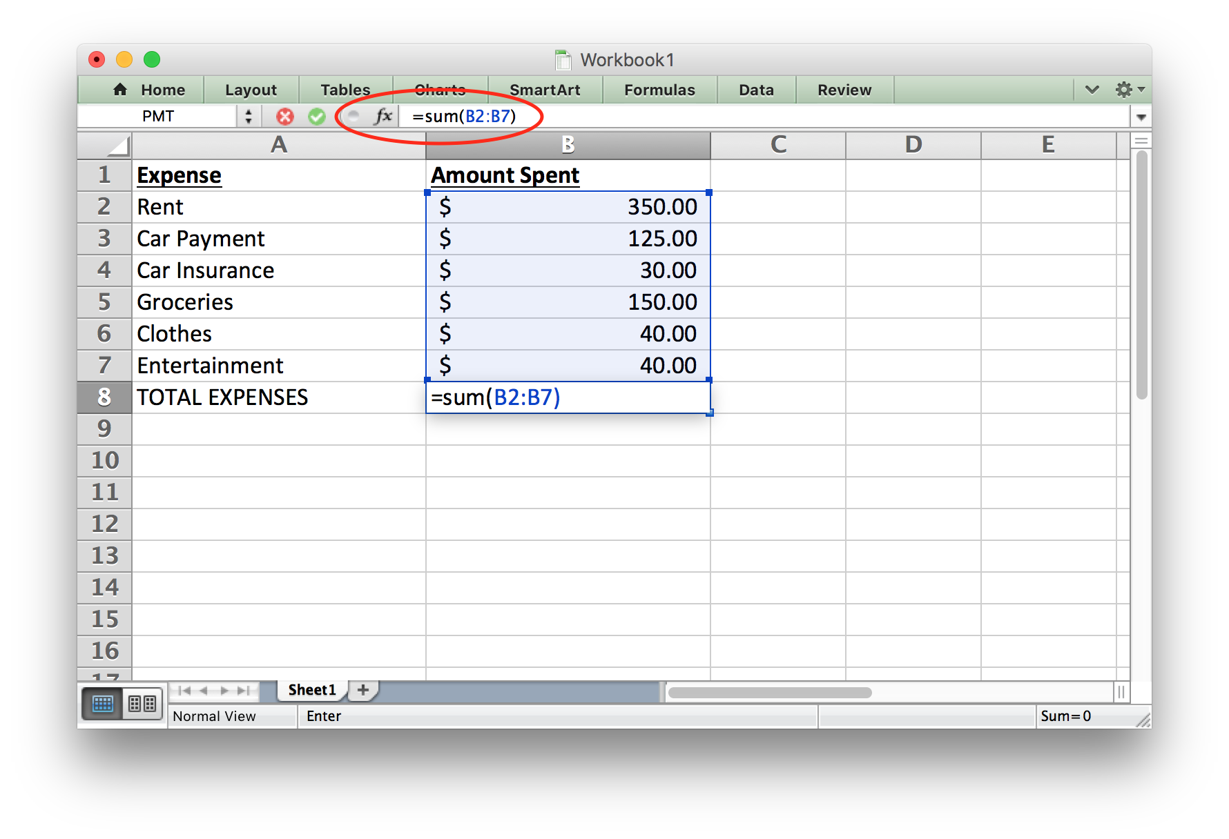 We could also use the SUM function in Excel to add up the interest payments for all 60 months of the loan. This tells us Craig paid a total of $524.96 in interest for the loan.