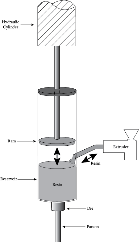 Accumulator Head or Ram Extrusion. In this system the extruder output flows into a reservoir that is external to the extruder itself. This system is shown in Figure 13.2.A ram, usually hydraulically driven, pushes the resin out of the reservoir and through the die that is mounted at the end of the accumulator to create the parison. The motion of the ram is tied to the mold cycle.
