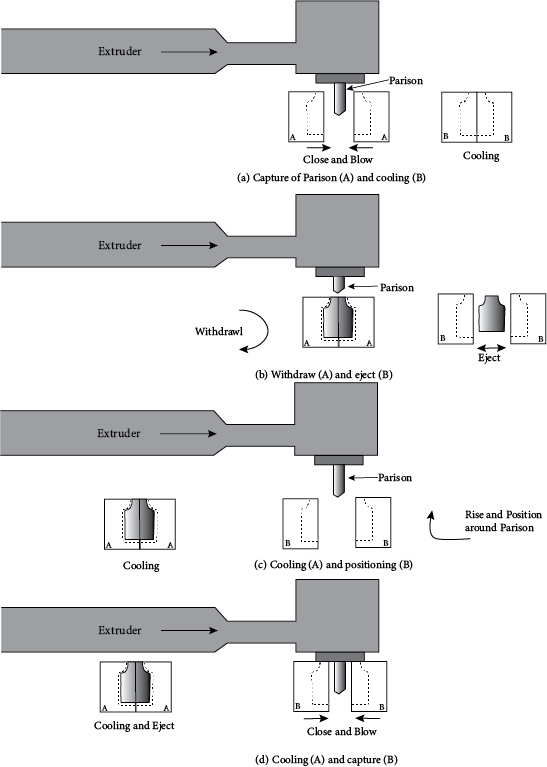 One problem in extrusion blow molding is caused by the continuous nature of the extrusion process. If during the time that the part is cooling in the mold the extruder continues to run, parison material will be extruded onto the top of the mold. This is obviously unacceptable and so some way must be found to either stop the extruder intermittently or to move the mold out of the way so that the new parison can descend without interference from the mold.