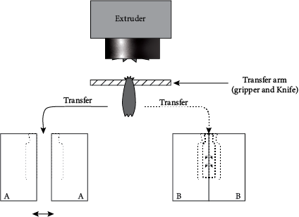 Parison Transfer System. In a system similar to the rising mold system, the parison is cut from the die by a knife and transferred by a mechanical arm to a mold where it is blown, cooled, and ejected. While this is occurring, other parisons are cut and transferred to other molds. This system, called the parison transfer system, is used rather than the rising mold system when the parts are quite large and the moving of large molds becomes mechanically difficult. This system is illustrated in Figure 13.4.
