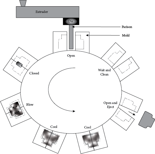 Multiple-Mold System. Another continuous extrusion blow molding method uses a multiple-mold system to match the output of the extruder with the molding cycle. Several molds are mounted on a rotating wheel, as shown in Figure 13.5. While one mold is closing to capture the parison, the mold ahead is in position for blowing of the part, and other molds are closed while the part is cooling. Still farther around the wheel the mold opens for ejection of the part and in preparation for capturing another parison. In this system the rotational speed of the wheel and the number of molds mounted to the wheel are matched to the extruder output speed. Equivalent systems have been developed in which the wheel is mounted horizontally instead of vertically.