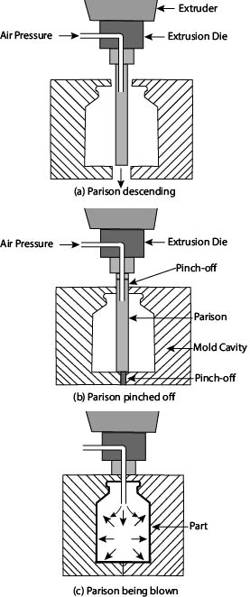 As the parison descends, the two-part mold closes on it (illustrated in Figure 13.1). In step two, the top and bottom of the parison tube are pinched off between the faces of the mold. At the top, the pinch-off area surrounds the air inlet tube so that the air inlet tube extends below the pinch-off area. In some configurations, the air inlet tube is at the bottom, but more commonly it is at the top, as shown in the figure. Finally, a blast of air is introduced through the air inlet tube and the parison is blown outward against the walls of the mold cavity. The cold walls of the mold cool and solidify the part. The mold then opens and the part is ejected.