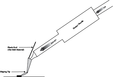 Hot-Melt Adhesives. Hot-melt adhesives are thermoplastic materials that are heated to a melt, applied to the adherents, and then allowed to harden by cooling. The most important thermoplastics used for hot-melt adhesives include ethylene vinyl acetate (EVA), polyvinyl acetates(PVA), polyethylene (PE), nylons, amorphous polypropylene, and various block copolymers, such as those between styrene and butadiene. Melt viscosity is an important factor in the application of these materials. Therefore, a key to their successful use is a proper heating/dispenser unit. For industrial applications, the hot-air welding tool (shown in Figure 21.8) is very common. In this device a rod of the solid hot-melt resin is fed into a shaping head where it is melted by hot air that is passing through the machine. The molten material is applied to the adherent as the shaping head passes over the surface.