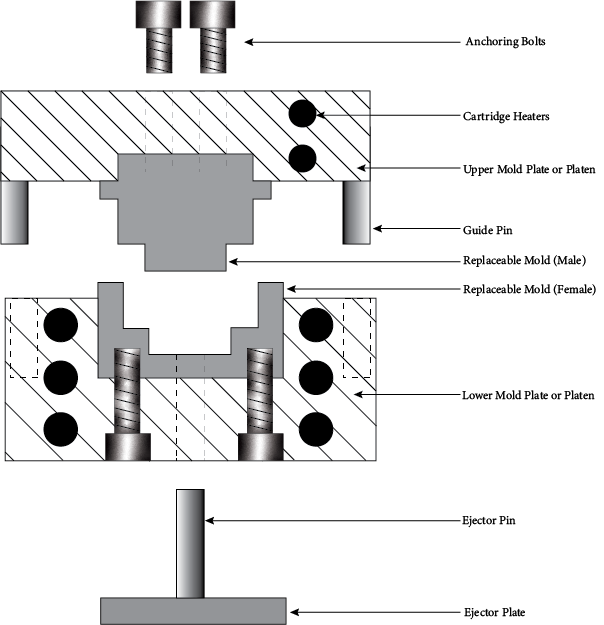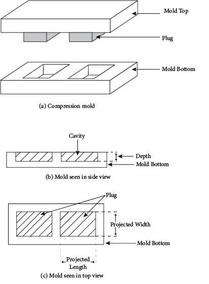 Figure 18.1 is a diagram of a compression molding machine, which shows the most important elements of the compression molding process. A compression molding machine is shown in Photo 18.2.