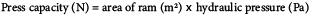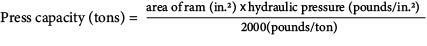 The maximum force required for a particular molding operation influences the choice of a compression press. The total force that can be exerted by the machine is called the press capacity, machine rating, or machine size and is stated in force units: newtons (N) in the SI system or tons in the English system. This machine capacity is a function of the area of the hydraulic ram and of the hydraulic pressure in the line going from the hydraulic pump to the hydraulic cylinder. The relationship between these hydraulic factors and the press capacity is given by equation (18.1). [When English units are used in equation (18.1), the conversion fact or, 2000 (pounds/ton), is used because the size of a machine is typically expressed in tons. When SI units are used, the press capacity is usually expressed in newtons (N) and no conversion factor is needed because pascals (Pa) are equal to N/m2 .] The press capacity is usually specified by the equipment manufacturer, and the operator generally will not be aware of either the area of the ram or the hydraulic pressure.