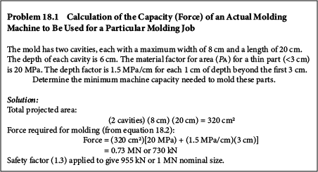 where F is the force required to mold the part, A is the projected area of the part, PA is the required cavity pressure for a particular material (PA is usually developed experimentally), ρ is an additional pressure factor (developed experimentally) that accounts for the effect of depth, and de is the depth in excess of the minimum amount. Calculations for determining the size of an actual machine to be used for molding a part are illustrated in Problem 18.1.