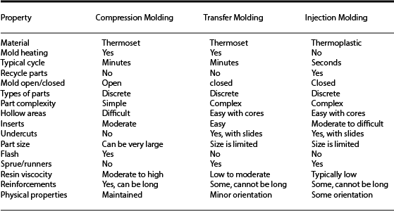 Table 18.1 Comparison of Compression Molding, Transfer Molding, and Injection Molding