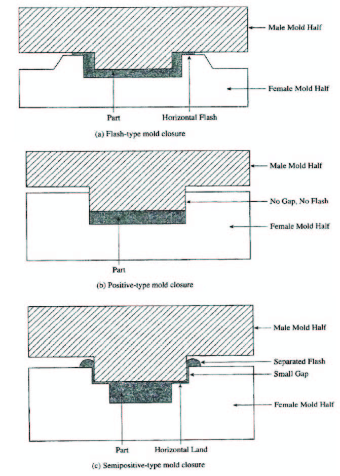 Three types of mold closures are typically used for compression molding: the flash type, the positive type, and the semi-positive type. These mold closures differ in the way the two mold halves mate, illustrated in Figure 18.4.