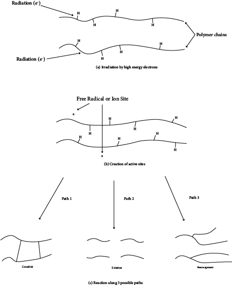The high-energy electrons can cause several changes in the polymer. The nature of these changes depends on the nature of the polymer, the energy of the electrons, and other processing variables, such as the time of exposure and the presence of modifying agents within the polymer material. In general, three main reactions can occur: cross linking, scission, and molecular rearrangement. (Scission, or chain scission, is the breaking of the main backbone of the polymer and is a form of polymer degradation.)