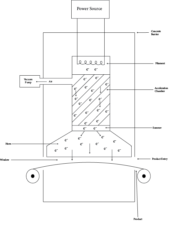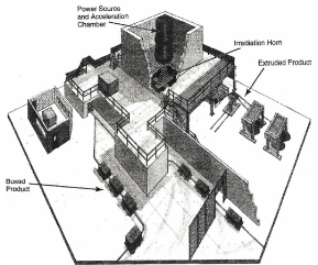 In electron beam radiation, the polymer material is bombarded with high-energy electrons that have been created in a large machine built specifically for that purpose. Such a machine is pictured in Photo 20.2. The diagram shows a typical layout of an electron beam operation. Note that both of the major types of products (boxes and continuous extruded lengths) are shown being irradiated. The irradiation horn, the output device for the electron beams, is located inside a concrete enclosure for safety purposes.