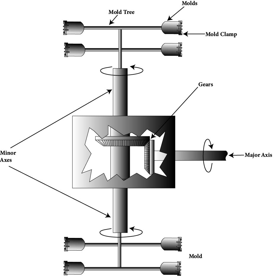 To obtain an even coating of the walls of the mold, the mold must be rotated about more than one axis. Experience has shown that an even coating can be obtained if the rotation is biaxial, that is, about two axes. Biaxial mold rotation is shown in Figure 15.1.