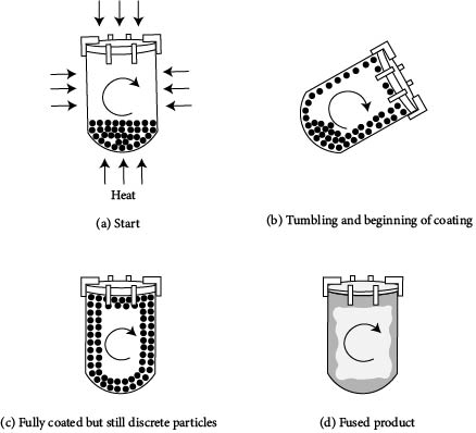 During the heating cycle, the rotation of the mold assembly causes the plastic powder to tumble inside the mold or, more accurately, the walls of the mold to pass under the pool of powder at the bottom of the mold (see Figure 15.2). The plastic powder eventually becomes hot and tacky and begins to stick to the inside of the mold. With additional heating and tumbling, all of the plastic eventually sticks to the walls of the mold. At this stage, the powdered plastic may still be small discrete particles, although some of the resin may also be fluid. With additional heating and rotating, the small particles and fluid join together into a continuous mass. This joining together is called fusion or sintering and occurs because the plastic particles are in a lower energy (more favorable) state when the number of surfaces is reduced. Obviously, the smallest number of surfaces possible is achieved when all the plastic particles have become one solid mass without interior surfaces. Therefore, the preferred energy state occurs when the particles join together or fuse. Note that fusion joins solid materials rather than materials that change to a liquid (molten) state and then resolidify. The particles in rotational molding rarely completely melt; although some liquefaction can occur, the process is still called fusion (or sintering).