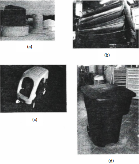 The rotational molding process, often called rotomolding, uses the rotation of a mold in a heated chamber to form the part. Rotational molding is ideally suited to the formation of very large, seamless, and stress-free hollow parts, such as 25,000-gallon (100,000-L) agricultural tanks, although the process has also been used to make parts as small as ping-pong balls. Some typical rotomolded products are shown in Photo 15.1.