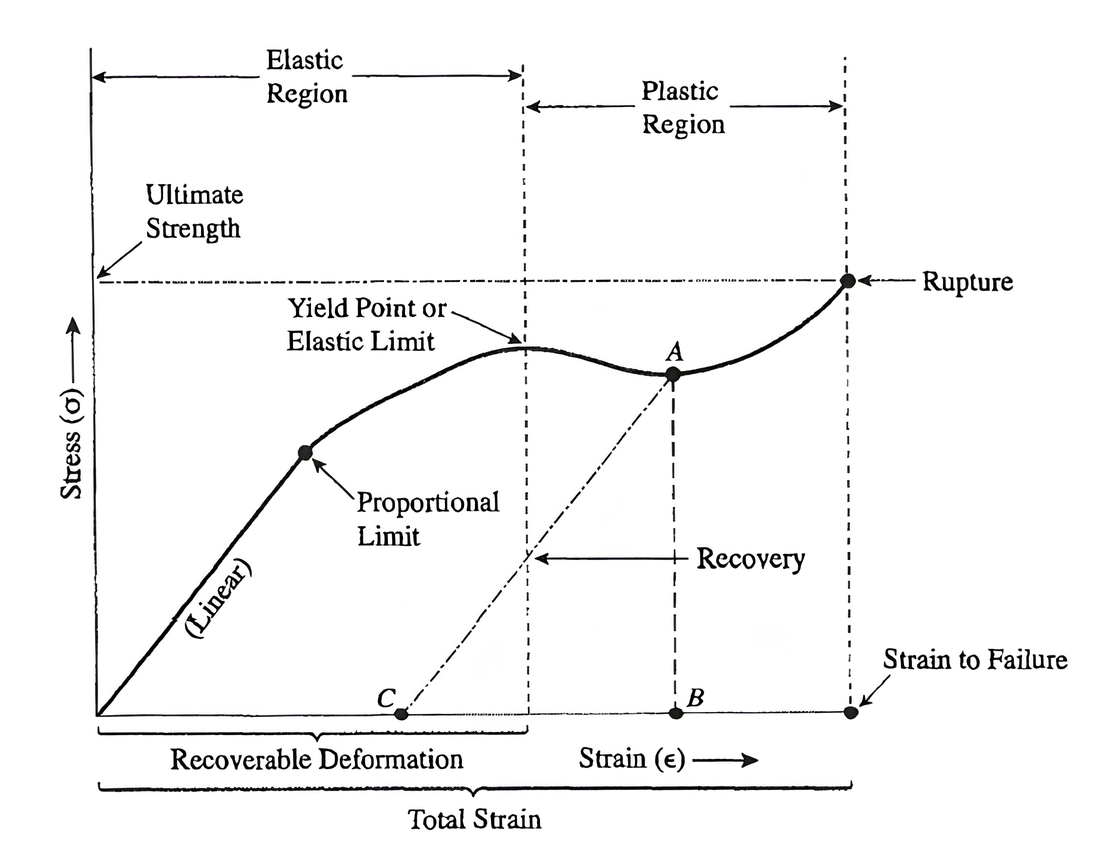 Beyond the yield point, the material is permanently deformed. That is, even when the stress is removed, the material will not recover its original shape. The region beyond the yield point is called the plastic region. The nonrecovery of shape is indicated using point A in Figure 4.9 as the point where the stress is removed. Point A is in the plastic region, that is, beyond the yield point. The loading follows the curve past the yield point and finally reaches point A. The strain at point A is noted as point B. When the stress is removed, the material will recover part of its original shape and move from a strain of B to a strain of C. (The recovery actually follows the dotted line from A to C. The dotted line is parallel to the slope of the stress-strain curve in the elastic region unless hysteresis occurs, and then the recovery could be nonparallel.) The distance from the origin to point C is the amount of strain that is not recovered, or permanent deformation.