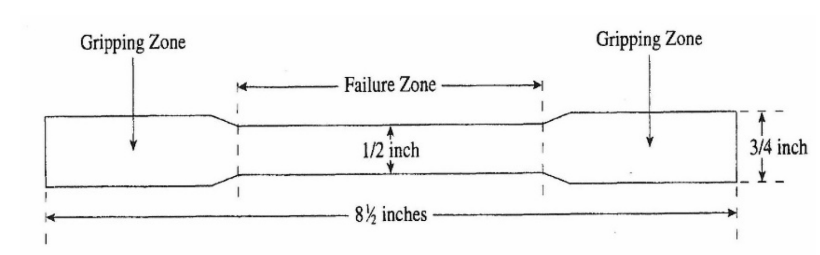 Tensile properties are determined using procedures such as those given in ASTM D 638. Normally, the sample is shaped so that the part will break be-tween the grips regions of the tensile test machine. The most common shape for plastic samples is a "dog-bone" shape, illustrated in Figure 4.12. The increased width of the sample in the gripping zones ensures that the sample will break within the failure zone.