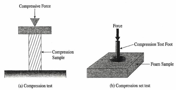 For foam samples and other fairly thick plastic materials that are subject to forces on the flat surface, the compression test is very important but is usually run under quite different conditions than would be used with a rigid plastic sample. The compression tester for foam samples has a compression foot with a large diameter to limit the penetration and registers quite low loads. The compression test for foams is therefore somewhat different from other compression tests, as are many other tests associated with foam materials, such as open-cell content, compression set, tear-resistance, and the various cushioning tests described in Chapter 17. Test results are compression strength (psi or Pa), compression modulus (psi or Pa), and strain-to-failure (inch/inch, mm/mm, or%). This test is illustrated in Figure 4.13b. When the yield point is exceeded in compression, a permanent deformation or compression set occurs. This compression set is important in characterizing the behavior of flexible foams.