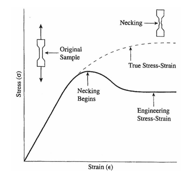 Behavior at the molecular level is illustrated in Figure 4.10 as the true stress-strain line. True stress-strain, as opposed to engineering stress-strain (the other line in Figure 4.10), is defined as the instantaneous value of the stress-strain curve (dσ/dϵ), rather than the change in strain divided by the original strain (Δϵ/ϵ0), which is the definition of engineering stress-strain. The true stress-strain is not used in common practice, but the situation depicted in Figure 4.10 illustrates its application. The true stress-strain curve shows the increasing resistance to the stress as the material deforms plastically. The engineering stress-strain, however, shows a reduction in the stress after the yield point. This reduction is a result of the thinning of the test sample. Because the sample thins (called necking), the force required to elongate the sample is greatly reduced and appears as a reduction in the stress-strain curve. In summary, the true stress-strain curve reflects what is actually happening at the molecular level a continuous increase in the stress while the engineering stress-strain curve reflects the necking of the sample and better indicates what a plastic part might do in actual use. Therefore, when the engineering strain-to-failure is reported, the value is often given as a ratio of the amount of deformation compared to the original length. In plastic materials, a related quantity, elongation, is even more commonly reported. It is simply the engineering strain-to-failure reported as a percentage of the original length of the sample.