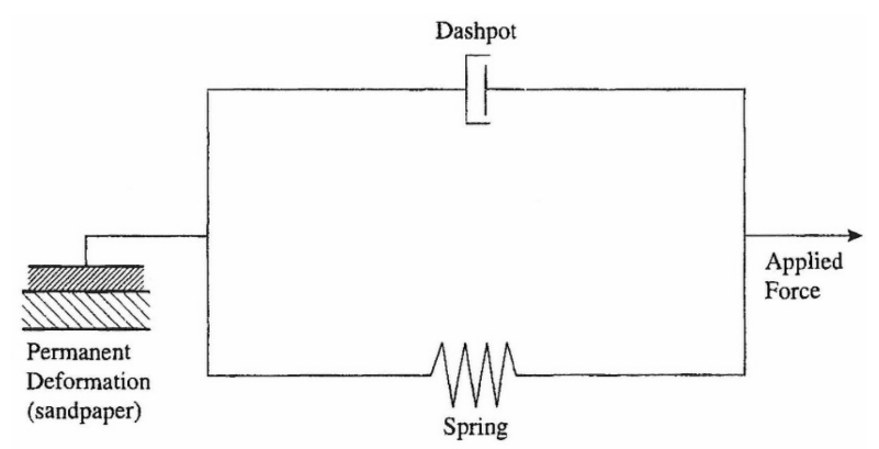 A model for the plastic deformation of viscoelastic materials can be built from classical mechanical elements, much as was done for the elastic and viscous cases. This model, shown in Figure 4.11, uses the spring and the dashpot elements and adds an element that represents a permanent deformation. The new element can be thought of as two pieces of sand paper, one stationary and the other pressed against the first. A minimum force is required to cause these two pieces of sandpaper to slide relative to each other, so some small movement can occur in the dashpot and spring without any movement in the sandpaper. If the minimum force that causes the sandpaper to slide is not exceeded, the movement of the system is reversible (returns to the original position when the force is relieved) and corresponds to elastic behavior. When the minimum force is exceeded, sliding of the sand paper will occur. This sliding is irreversible because the sandpaper will not slide back when the force is removed. This behavior corresponds to plastic behavior.