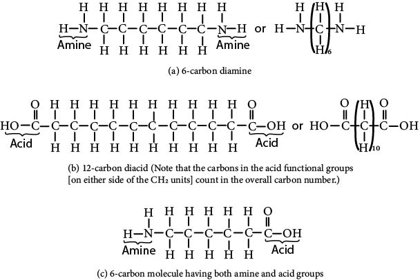 The differences among the various types of nylons largely depend on the number of carbons in the molecular segments between the amide groups. These segments are simply the CH2, units existing in the monomers used to form the nylon polymer. Hence, if the nylon is made from a diamine made up of six carbons, as shown in Figure 8.2a, and a 12-carbon diacid, as shown in Figure 8.2b, the resulting polyamide would be named nylon (6/12), which is pronounced "nylon-six-twelve." (The number of carbons in the diamine is given first followed by the number of acid carbons in the carbon number designations.) Polyamides can also be formed from just one monomer if that monomer has an amine group on one end and an acid group on the other. Such a monomer is shown in Figure 8.2c. The resulting polyamide from the combination acidamine would have six carbons between each of the amide groups but, because only one monomer is used, the polymer name would be nylon (6). Nylons of many different types are being sold commercially, including nylon (6), nylon (11), nylon (12), nylon (6/6), and nylon (6/12). The most widely used of the different types is nylon (6/6), which was also the first made.