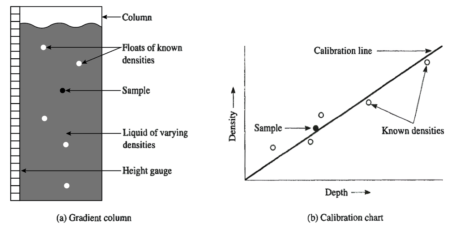 - Density-Gradient Technique (ASTM D 1505). The density of materials is determined by comparing the point at which a small sample (usually a pellet) will be suspended in a fluid of varying density with the suspension points of small glass floats of known densities. This method uses a density-gradient column prepared by adding two miscible liquids (usually water and ethanol) in varying concentrations so that more of the dense liquid is near the bottom of the column and more of the less dense liquid is near the top. The glass floats of known density are then carefully added to the column. The floats sink according to their densities and, by noting the depths, a plot of depth versus density can be established for the column. Then the plastic samples are added to the column and, by noting the depth at which they are suspended, their density can be read from the calibration chart. After some time (usually weeks), the liquids in the column mutually diffuse and the column must be refilled and recalibrated. A density-gradient column is illustrated in Figure 3.3.