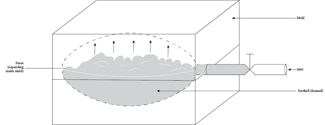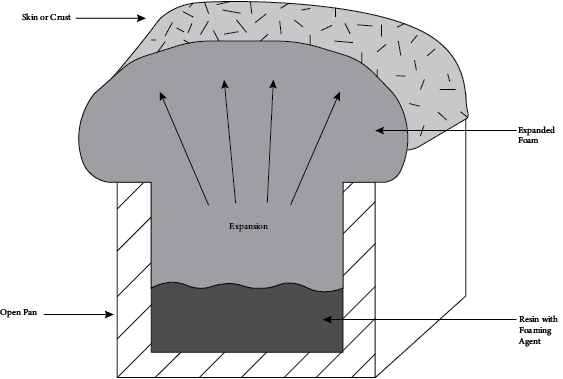 Foamed liquid materials can be injected or poured directly into molds that define the shape of the product after solidification. Two somewhat different methods are used to control the manner in which the foam expands within the mold. In the first method, called low-pressure foam molding, a metered volume of liquid resin containing the foaming agent is introduced into the mold. The volume of this as yet unfoamed or partially foamed material is much less than the volume of the mold, but it is soon allowed to expand to fill the mold. The trigger for initiation of the foaming action can be a reduction of pressure when the material is introduced into the open mold, much like the foaming of materials that occurs when the materials are released from a pressurized can (such as shaving creams, whipped cream, and stop-leak agents for tires), or it can be an increase in temperature if the mold is heated. The type of triggering action depends on the type of foaming agent used. Expansion of the material takes place because the foaming agent creates bubbles within the liquid resin that cause the volume of the resin to expand (see Figure 17.1). This expansion is limited by the size of the mold and is called low-pressure foam molding because the expansion occurs against no external pressure. The expansion process itself may create a slight pressure, but it is trivial.