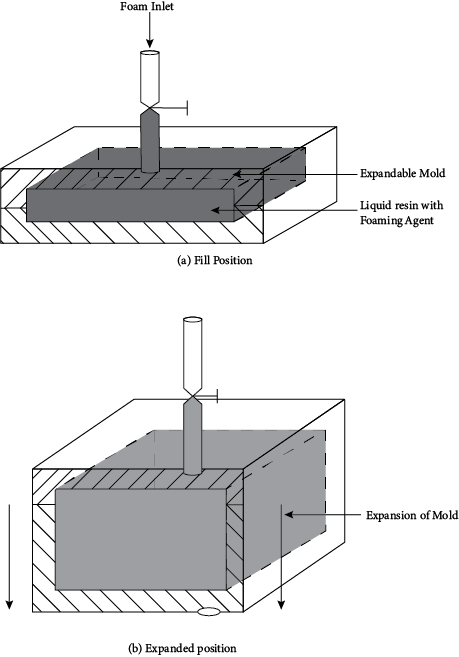 The other method of controlling the expansion of the foam in the mold involves expansion against an external pressure. Hence, this method is called high-pressure foam molding. It is important to note that even though the process is called highpressure, the pressures are high only in comparison with the essentially zero pressure of lowpressure foam molding and are not high when compared to plastic-molding methods such as extrusion and injection molding. In high-pressure foam molding, the liquid resin with foaming agent is introduced into a mold is mechanically expanded at a set rate as the foaming occurs. The expanding cavity controls the amount of foaming that occurs and therefore determines the density (volume and amount of foaming) of the foam. This process is shown in Figure 17.2.