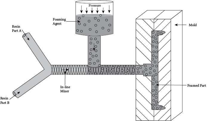 An important process for foam molding is called reaction injection molding (RIM). In RIM, two reactive components are metered together and mixed inline so that they begin to react in either a polymerization or crosslinking reaction. (The RIM process, which is also used to make non-foamed parts, is described in more detail in Chapter 18.) To make a foam by the RIM process, a foaming agent is added to the resin stream and mixed in the inline mixer. This mixed resin material is then injected into a closed mold, where it begins to expand. By balancing the rate of resin injection and the rate of foam formation the mold will fill with a material of the desired density. This process is illustrated in Figure 17.3. The reactive nature of the resin components is the origin of the "reaction" part of the RIM name. The most commonly used resin for RIM is polyurethane, where the polyol is part A and the isocyanate is part B. In some cases, the foaming can occur by the reaction of the isocyanate with water to create carbon dioxide. Hence, the foaming agent can simply be water, although other foaming agents can also be used.