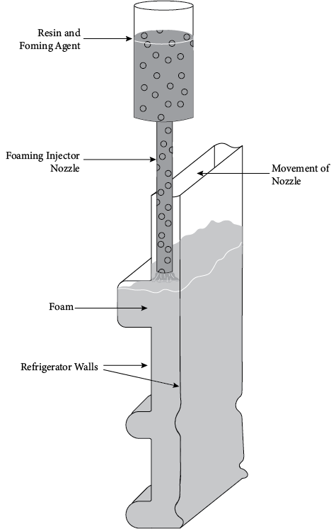 Another foam molding process is called foam-in-place. As in RIM, the foam is injected into a cavity at a rate that balances the foaming of the material in the cavity and the injection rate. This balance gives the proper foam density. The difference between foam-in-place and RIM is that in foam-in-place the materials that make the foam usually don't react as the foam is being made. Foam-in-place is used to insulate between the walls of a refrigerator by injecting the foam between the joined inner and outer walls. The foam simply solidifies in place. This method allows sequential assembly steps, including the wiring of lights and other devices within the refrigerator walls, then joining of the inner and outer walls, and finally the injection of the thermal insulation foam. The ability to inject the foam after all the other steps have been done simplifies the assembly process. To facilitate the foaming into long, deep cavities, a foam-injection nozzle places the foam inside the cavity extremities (see Figure 17.4).