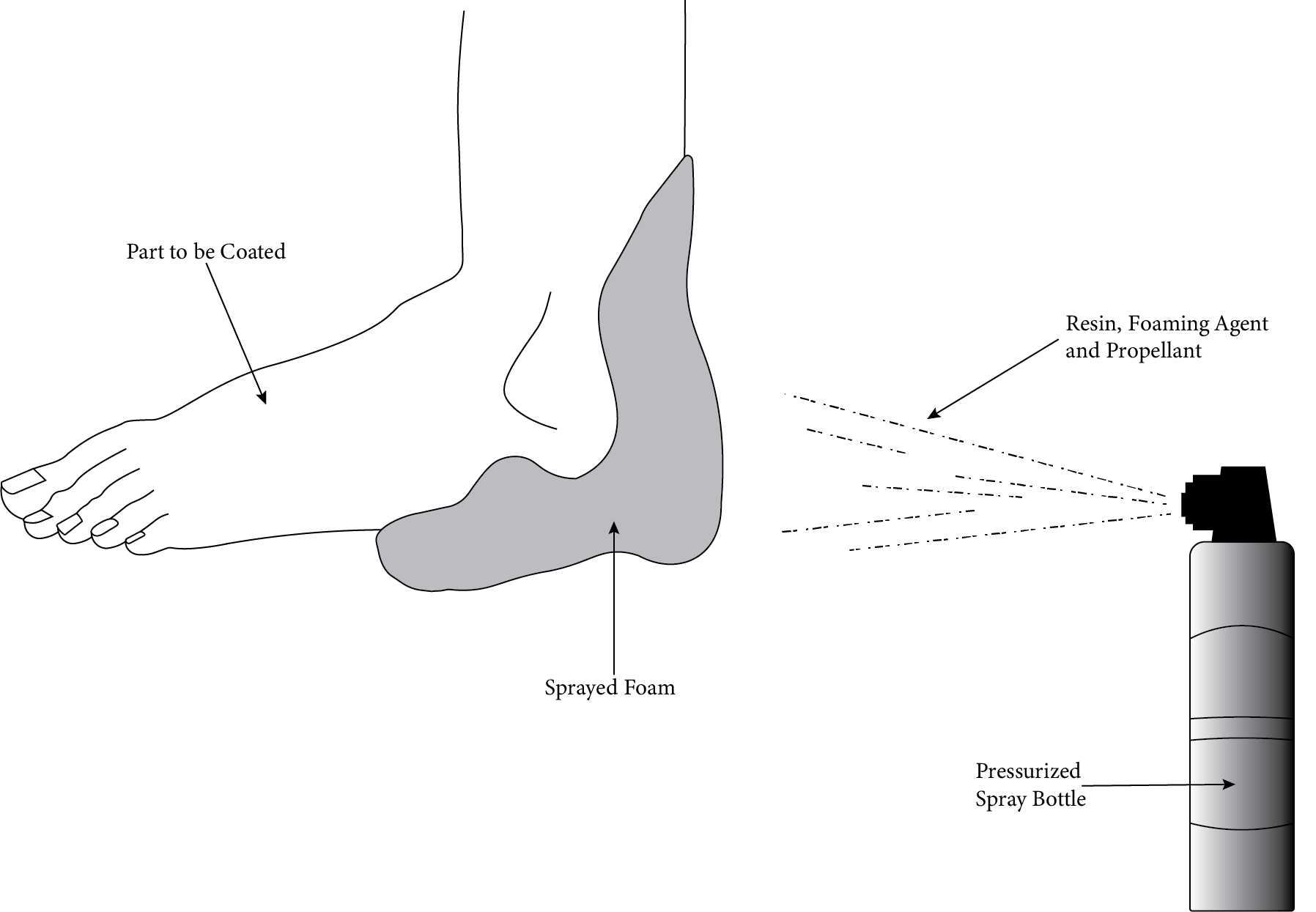In spray foaming, the resin and a foaming agent are mixed and then held in a pressurized bottle or in some kind of pressurized line. A propellant for carrying the resin and foaming agent may also be included in the bottle or line. The material is sprayed onto a surface to be coated with the foam by simply depressing the valve on the pressurized bottle or by actuating the trigger on the nozzle device (usually a spray gun) attached to the feed line. When the resin, foaming agent, and propellant are sprayed onto the surface of the item, the foaming agent causes the resin to expand freely. The propellant escapes into the atmosphere. Figure 17.5 illustrates this system for a spray bottle and Photo 17.4 for a spray gun.