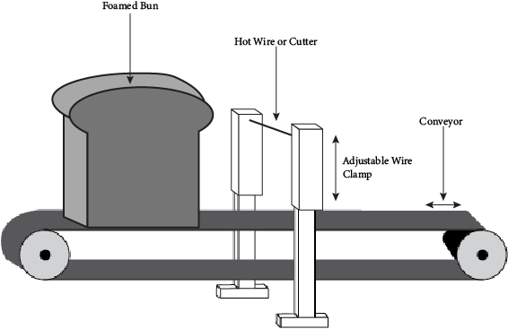 Skiving of foams is done with knives or saws, as with other plastic materials, but it can also be done conveniently with a hot wire. Typically, the wire is a high-resistance metal heated by simply running an electric current through it. The wire is held by a clamping mechanism that can be adjusted vertically to obtain various slab thicknesses. The bun is then moved against the wire slowly so that the wire melts the foam. As the bun is moved past the wire, a foam slab is separated from the rest of the bun. This process is illustrated in Figure 17.8 and in Photo 17.6.