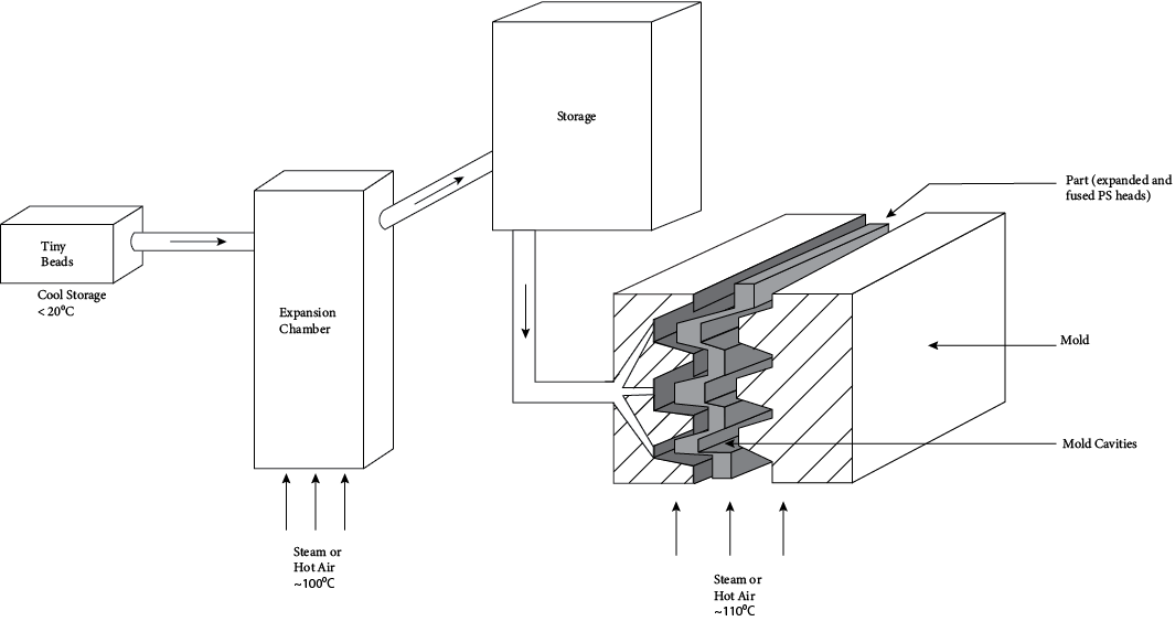 Molding of the expanded beads is done by conveying the beads to the mold area and blowing them into the cavities of a closed mold. After the cavities are filled, hot air or highpressure steam is blown through the cavities such that the temperature of the beads reaches about 212° to 220°F (100° to 110°C). At these temperatures, the styrene again softens and the residual volatile solvent expands, further enlarging the beads. Because the beads are confined in the cavities, the softened particles press together and eventually fuse to become a single mass of connected beads. If done properly, the fusion of the beads is such that all holes (pores) between them are sealed by the softened resin. The parts are then cooled by blowing cool air or water through the mold or by running cool water through cooling pipes within the mold body. The mold is then opened and the parts removed. (The machine that holds, opens, and closes the molds is much like the hydraulic system and mold-handling system of an injection molding machine.)
