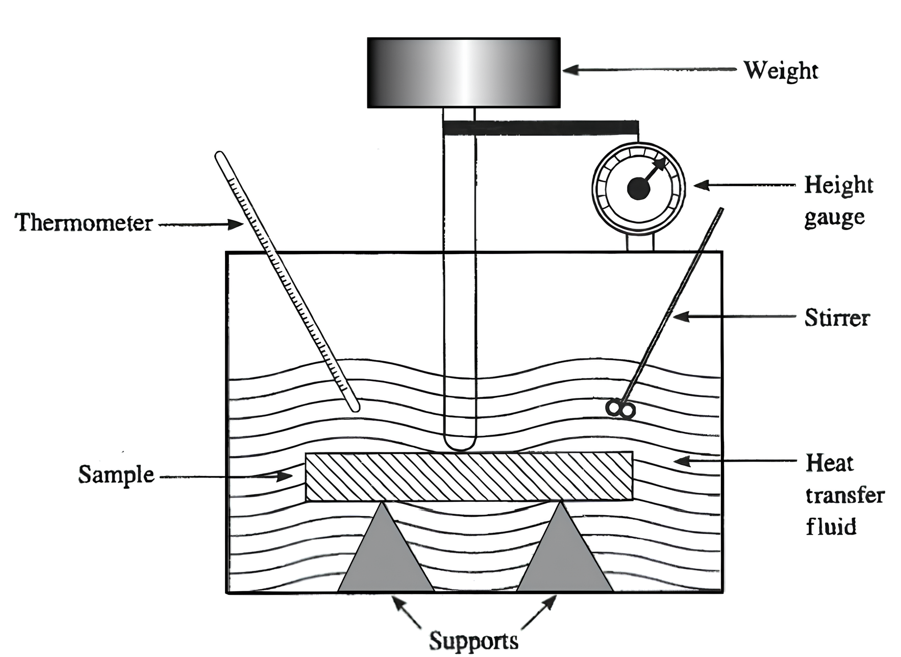 A convenient test, the Deflection Temperature Under Load (ASTM D648), can be used to measure this upper use temperature. In this test, illustrated in Figure 3.5, a sample of the plastic material (5 X ½ X ¼ in.) is placed in a heated bath of mineral oil or some other liquid that is thermally stable at the temperatures to be used, does not react with the plastic, and will transfer heat readily to the sample. A specific weight (designated by the test procedure and dependent upon the type of plastic material being tested) is then placed on the sample. The entire apparatus is then heated, usually with stirring to ensure good heat evenness in the liquid. The temperature at which the sample deflects (bends) a specified distance under these conditions is the Heat Distortion Temperature (HDT). The HDT is often considered the maximum structural use temperature, especially for any application in which the part will be loaded mechanically.