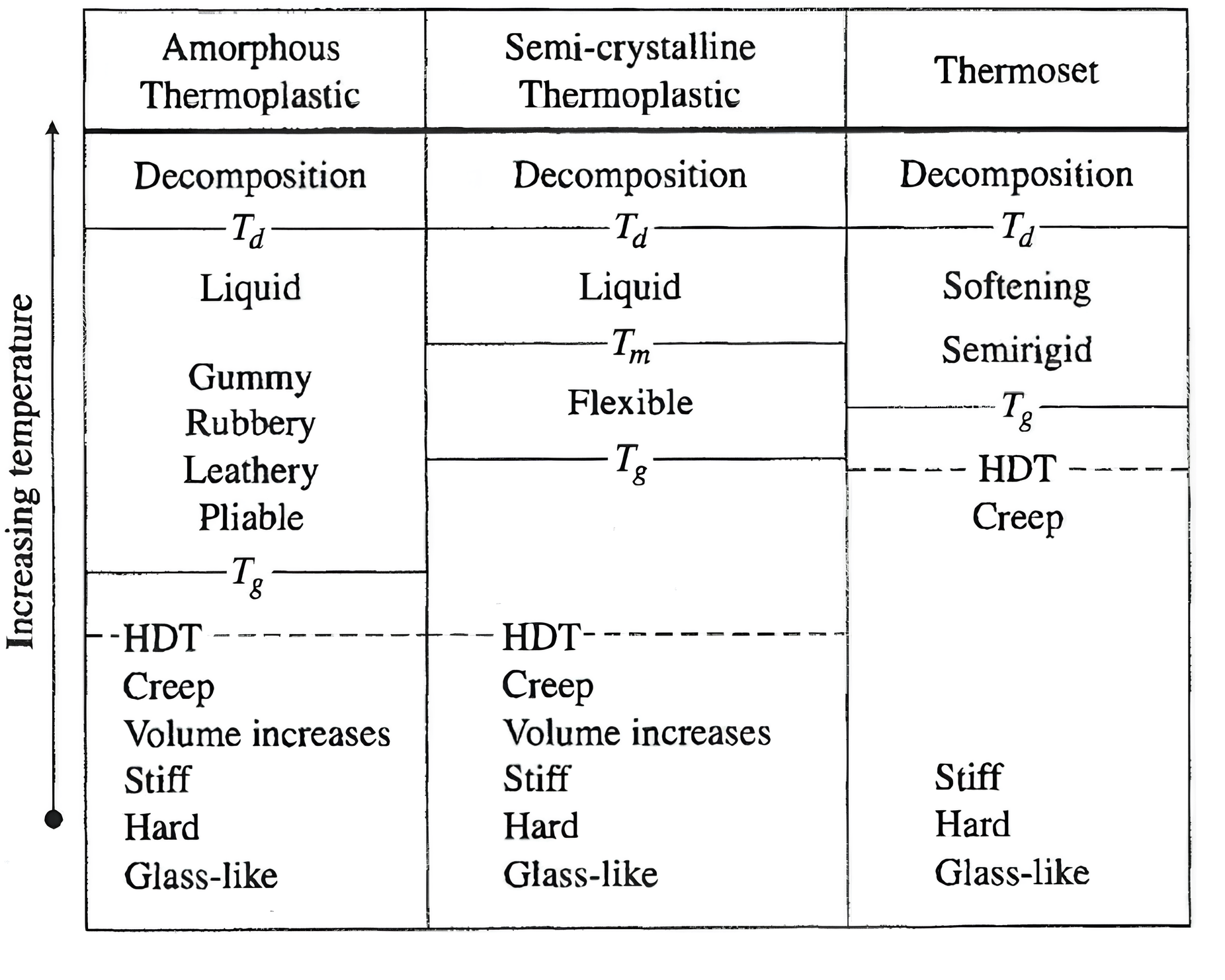 Figure 3.6 General thermal behavior for thermoplastic and thermoset plastics.