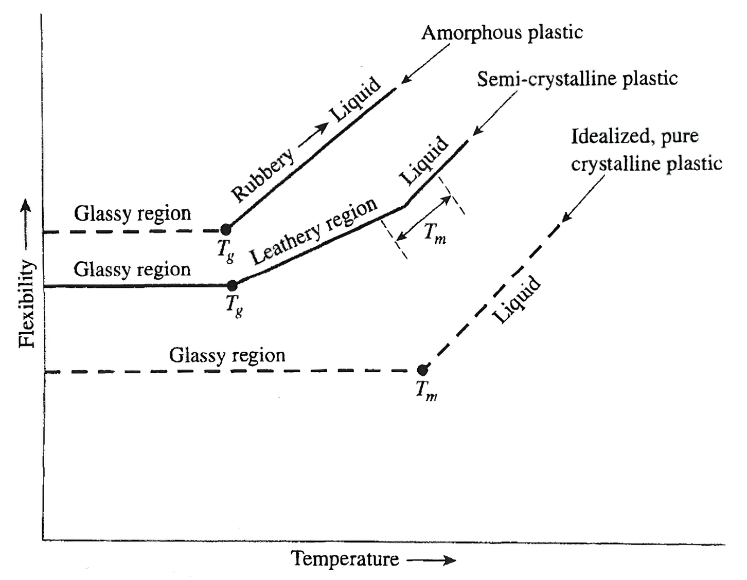 Amorphous materials are relatively rigid, stiff, and brittle at temperatures below Tg, the glassy region, with mechanical properties somewhat like crystalline polymers. Above Tg, the material becomes significantly softer and takes on many physical characteristics that are much like leather (tough, pliable, flexible) and therefore it is called the leathery region. These relationships are illustrated in Figure 3.7.
