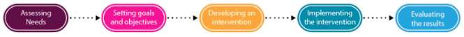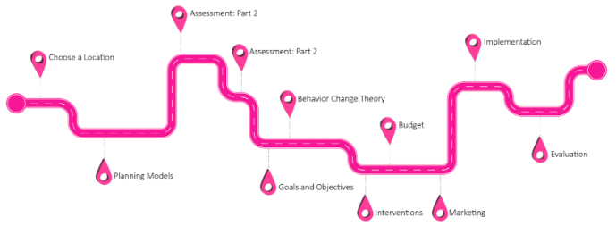 In the road map below, you can see that there are some major stops along your journey. Each of these stops is a major skill that will be utilized in the program planning process, during which you will be given room to learn about and practice using each of these skills. There are also some minor stops in the map; these are equally important aspects and act as tools to help us with our program planning. Let’s briefly look at each stop so that you know where this is all going.