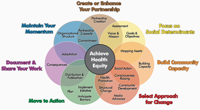 By effectively addressing the social determinants of health, we can create a healthier community, and improve the quality of life for all. The figure below (from the CDC Report) outlines seven phases and related steps in addressing social determinants of health in your community.