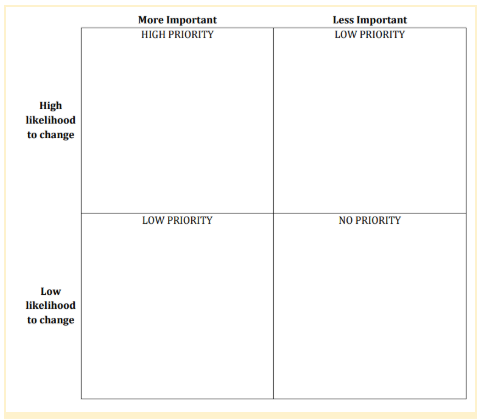 Assessing Changeability: For each intervening variable, use this 2x2 table to help you prioritize your contributing factors. First, is your contributing factor important? To what degree does this contributing factor affect opioid misuse in your community? Next, how easy or difficult is it to bring about change in the contributing factor? Based on those two questions, place your contributing factor in one of these boxes. Whatever ends up in the most important and most changeable quadrant of the 2x2 matrix is your prioritized focus. You may need to run this prioritization process a few times to narrow down to the top contributing factors to focus on.